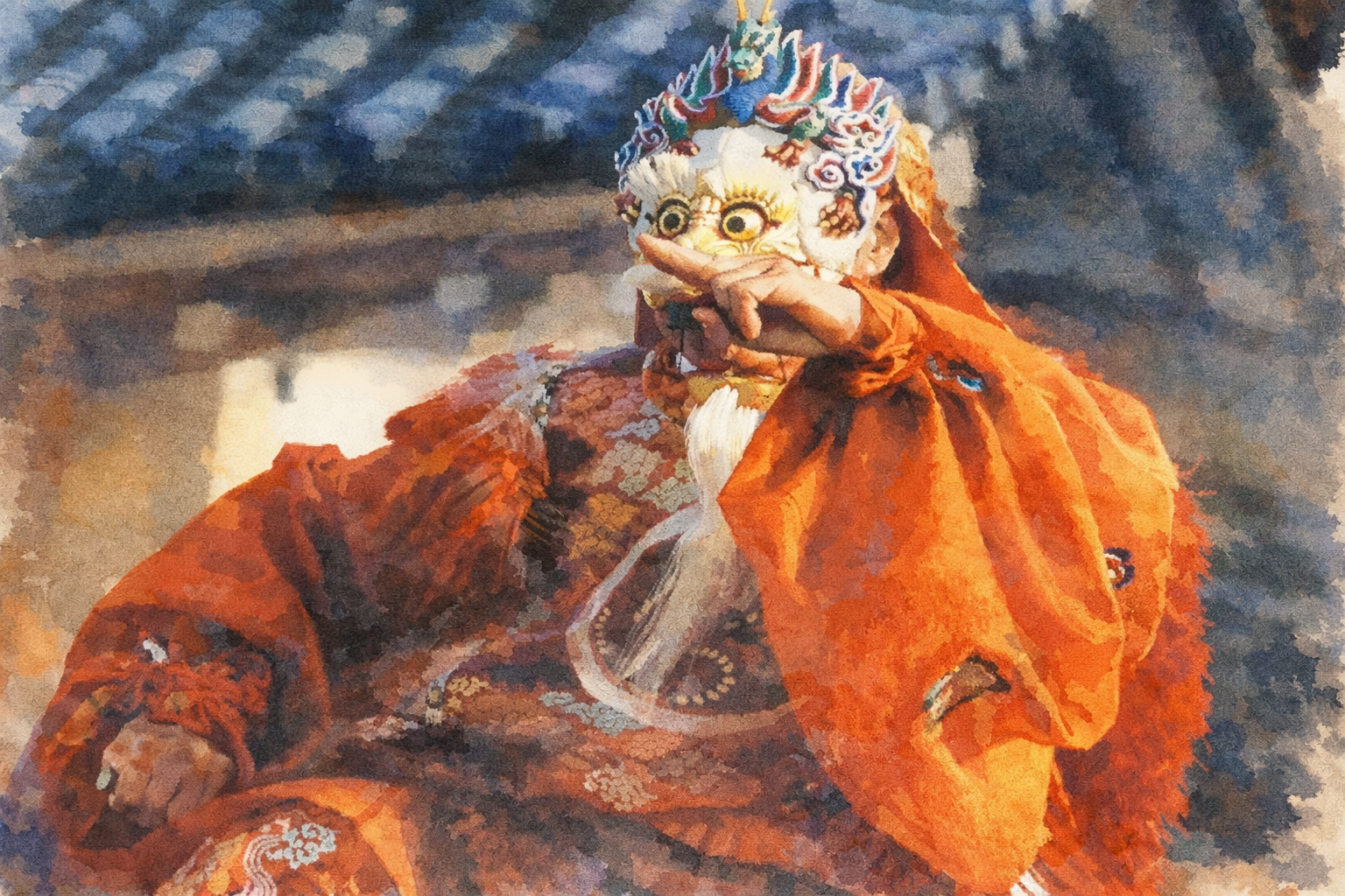 蘭陵王(らんりょうおう)」は、激しく動く「走舞(はしりまい)」を代表する演目です。