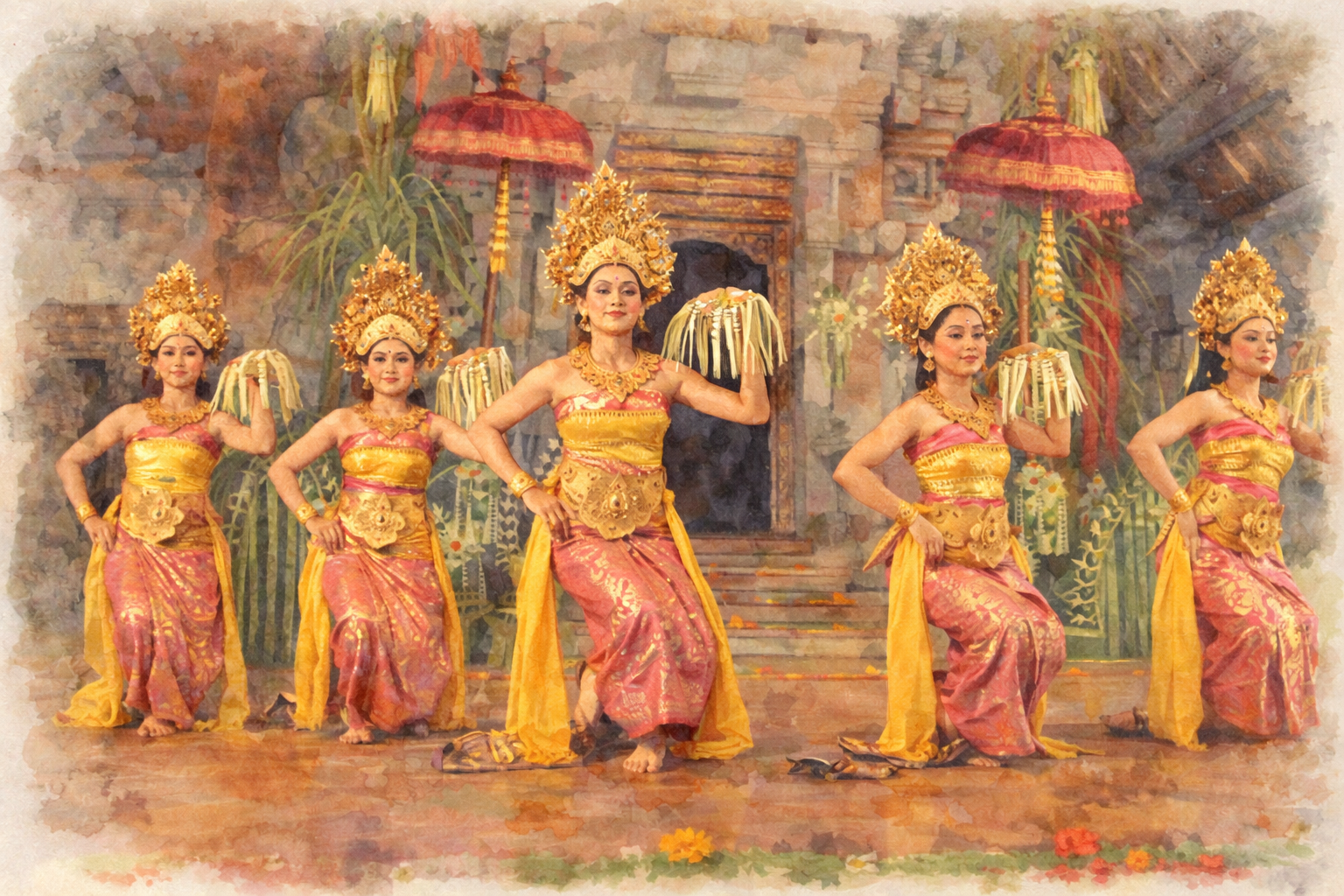 舞踊はガムラン音楽と一体化して、流れるような動作と激しい動作がドラマチックに演じられます。