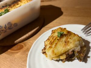 シェパーズパイとは、ひき肉とタマネギを炒めた具を、マッシュポテトで覆い、オーブンで焼いたものです。